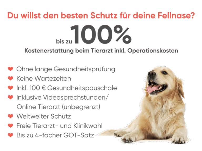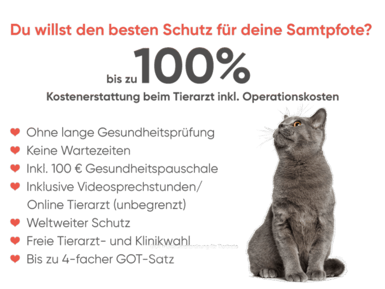 - Eine Tierkrankenversicherung für Hunde und Katzen, deckt die Kosten bis zu 100 % ab.